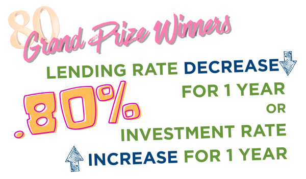 Members have a chance to win either a .80% decrease on a lending rate or .80% increase on an investment rate. This can save you some serious cash until the end of 2026!